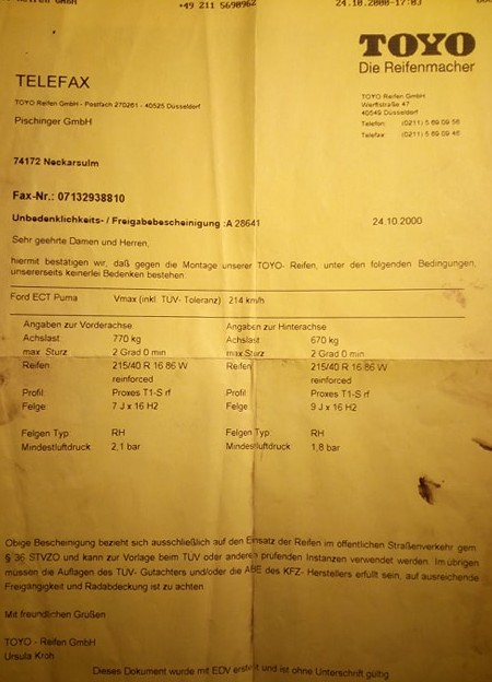 Това не знам в коя държава го има, но ето виж на комшията PUMA-та с какви гуми и джанти се е обзавела три години след като е излязла от завода в Германия, 7J предни джанти, и 9 J задни джанти 16 цола: