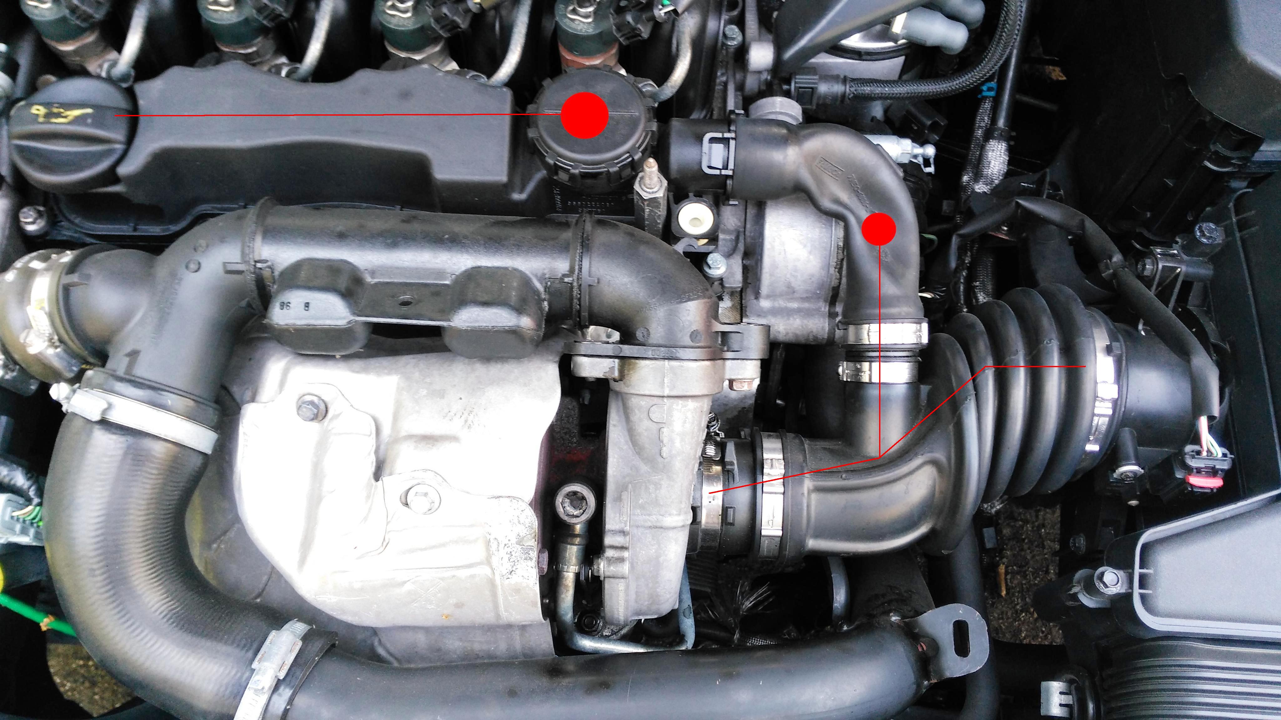 Имам проблем с един сплескан маркуч, който отвежда картерните газове към турбото. Двигателят е дизел 1.6TDCI, 109 к.с., а колата е Фокус МК2 комби от 2008 г. Напоследък мощността стига само до около 3000 оборота и при лек баир се усеща немощ на двигателя. Освен това текна масло пред турбината и някъде около дюзите (не е гориво, сменил съм дихтунгите). След оглед на комшиите, каращи дизели ми казаха, че този сплескан маркуч, който се вижда на снимката пречи на двигателя "да диша" и е резултат от запушване на клапана или филтъра преди него (което причинявало и течовете) и това трябва да се оправи и после да се търсят и отстраняват течовете на масло, но при свалянето на капачката вероятно ще се изпочупят скобичките, които я държат към зъбците на гърловинката.