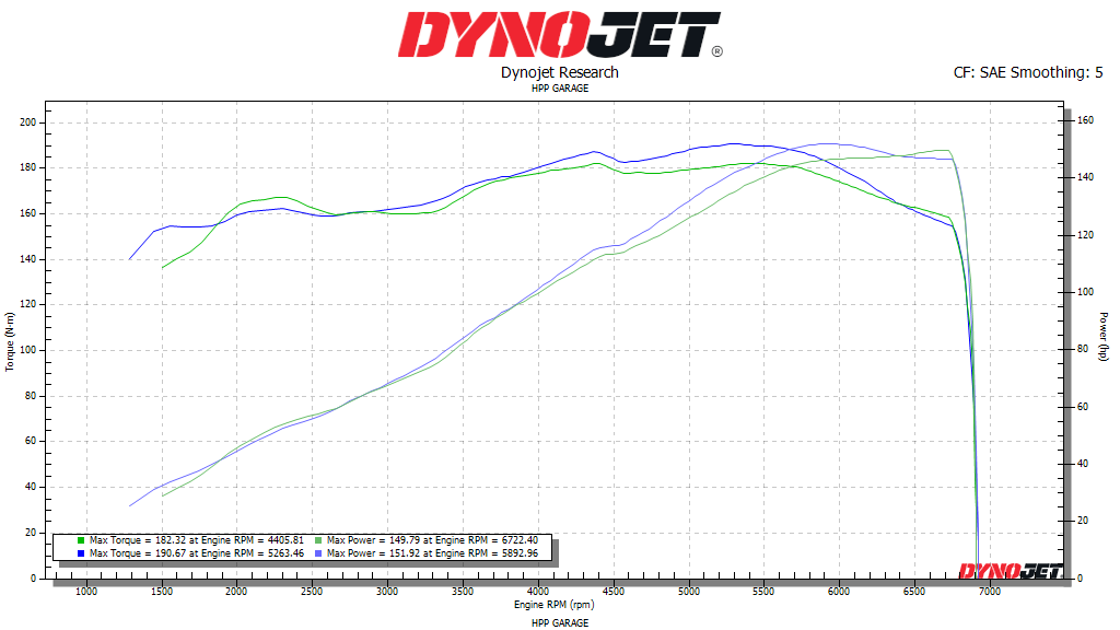 Това е графика от личната ми кола, която е с 2.0 дюратек, мощността и нм са на гуми, така мери това дино. Като с друго крайно гърне цифрите са 151 кс, но заради пътувания е леко спъната. Реално има валове, филтър и спортен катализатор, засега е на заводски колектори.