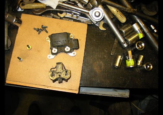 Реших да проверя състоянието на четките и пръстените по който те контактуват с ротора /колектор/. Тъй като съм го правил това упражнение преди 2 год. бързо докопах плочката-четките /реле-регулатора/.