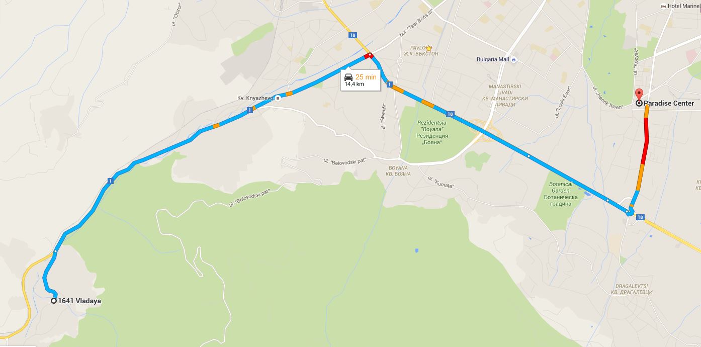 Ако идваш от Благоевград, от където пише, че си, караш Владая, Княжево (демек си в София вече), стигаш до Горнобански път, десен по Околовръстното до Черни връх, кръговото на Фантастико/Драгалевци, у лЕво по Черни връх и стигаш Парадайз мол. Това е най-прекият и бърз път и освен това, за което ти писах, че видях табели, няма ремонти, само задръствания може да те хванат