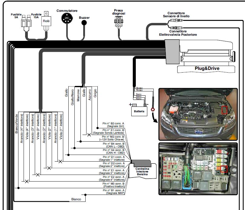 С малко закъснение мисля, че разбрах от къде идва този феномен. Налбюдавах го и на идентичен фокус със фабрична газова. Оги, предложението ти не е лошо, но бензина зимата не се задържа много в резервоара и често се сипва (на месец по 30-40 лева ако се кара всеки ден колата). А и ако има някаква разлика в горивния процес при преминаване от газ на бензин късия трим ще се промени внезапно, а както виждаш на графиката той едва помръдва. Та с голямо усилие успях да намеря схемата на свързване на оригиналната газова, макар и на италиански. На нея ясно се вижда, че момчетата от БРЦ не просто tap-ват сигнала от ламбда сондата (както е при повечето газови), а направо си го прекъсват и прекарват през газовия компютър. Така, че мисля, че когато колата работи на газ сигнала е леко обработен от газовия компютър. Прилагам схема, на която се вижда, че кабела със сигнала от лабда сондата е прерязан и превързан през газовия комп (както инжекторите):