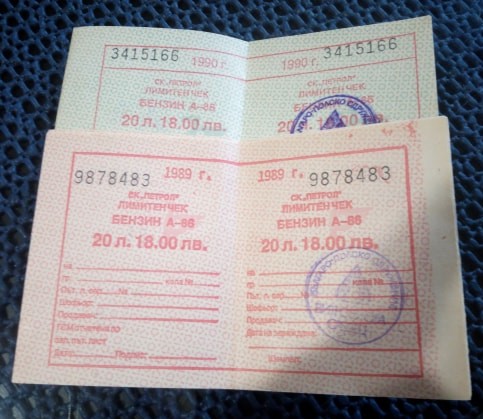 Ехееее, бонове за бензин останали ми от 1989 и 1990 година, поради дефицита по бензиностанциите- за 260 литра бензин А-86 октана.