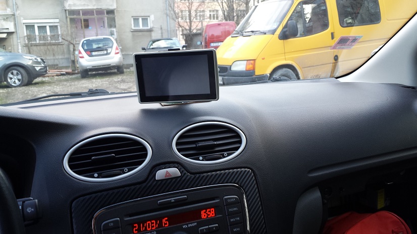 Отпред на стъклото не ми хареса,намаля видимостт а и ми е далеко.Изрязах от една подложка за чаши,която от горната страна е гланцирана(да може да залепне вакум лепката на стойката) и с помощта на силно двойноподлепящо(и две тухли за тежест) за около 1час работа,мисля че се получи добре.