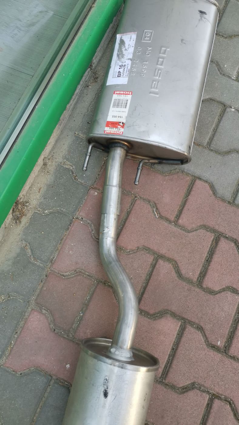 Днес изхвърлих задно гърне, средно гърне с всичките тръби помежду им чак до меката връзка откъм двигателя, както и накрайника на ауспуха. Заедно с тях скобата по окачването, гарнитурата м/у средното гърне и меката връзка и всичките тампони. Адски изненадан съм даже, че 25 години нищо не е пипано по генерацията и изкара до сега.