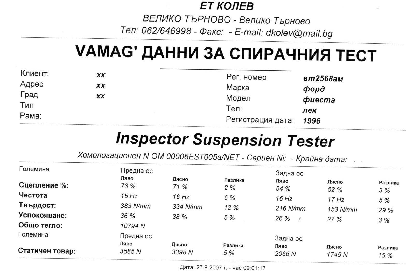 След това проучих къде има стенд за тест на амортисьори и отидох там. Хората ми се сториха че много не му разбират ама в крайна сметка ми дадоха разпечатка и ми казаха да си оправя другите неща по предницата и да си карам с тези амортисьори.