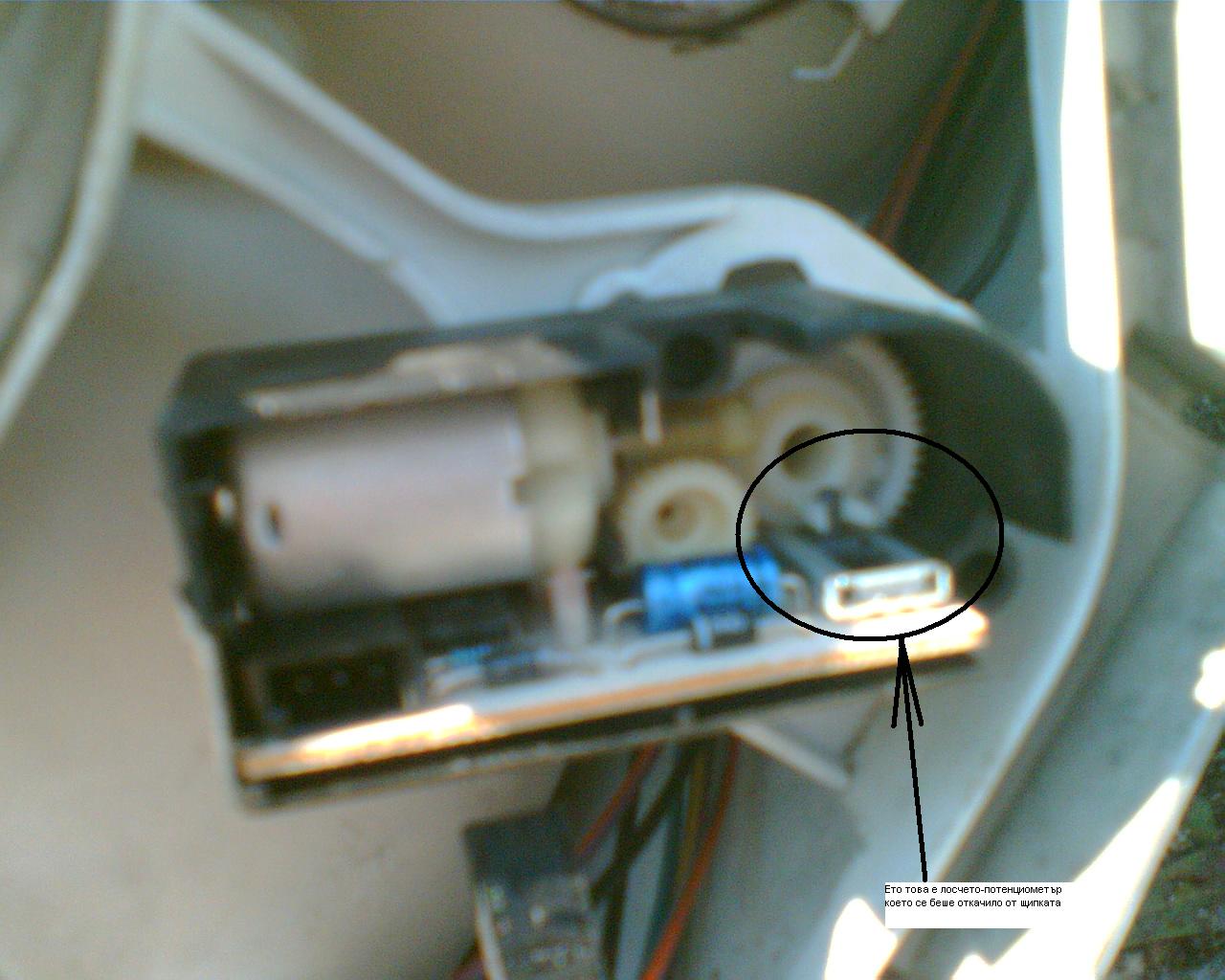 Такааа,днес се запретнах и си намерих проблема сам..Няма оголени кабели и такива неща,просто към моторчето си отива постоянно ток,а вътре има нещо като потенциометър което играе роля и на прекъсвач.Той е защипан за зъбното колело и моторчето като върти и избутва лосчето на определена позиция и изключва веригата...Снимката е малко мътна,защото е от телефона,но горе-долу се добива представа..Явно като съм сменял крушката съм понатиснал тук-там и лосчето е излязло от щипката...