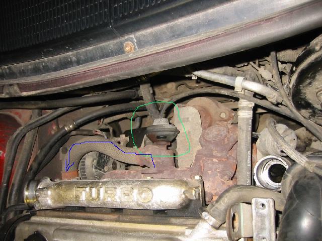 Обяснавам защо - на повечето стари автомобили клапана(тва което е ограсдено в зелено на картинката на aaleks ) изпуска дори и в затворено положение(моя изпуска по малко и навън), тоест изгорелите газове преминават от изпоскателния право в смикателния колектор и "душат" двигателят, а маркучето което прекъсва aaleks управлява клапана. Поставяйки заглушката м/у фланеца до синята стрелка и всмук. колектор вие прекъсвате потока напълно, а с прекъсване на тънката тръбичка помагате на заглушката да не прегори.