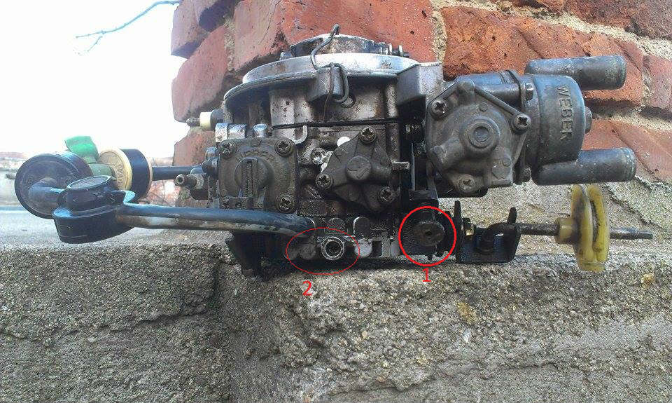 Карбуратора ти е с автоматичен смукач, затова като запалиш, докато загрее, държи 1400оборота (нищо не можеш да направиш). След като загрее добре, отвори капака на филтъра и виж дали въздушната клапа (смукача)дали е напълно отворена, ако не е разхлаби болтовете на тялото на смукача и врътни тялото по каналите така, че клапата да е вертикално. След това затвори капака на филтъра и запали колата и регулирай оборотите при нужда. За да регулираш оборотите развий винт 1 докато оборотите станат нестабилни, след това завиваш винт 2, оборотите ще се вдигнат, после пак развиваш винт1 и завиваш 2, докато оборотите спрат да се вдигат при завиване на 2, тогава завиваш винт 1 докато оборотите станат 800-850. Ако след това има проблем с ускоряването, развиваш леко винт 2 и установяваш оборотите с 1. след това при нужда от корекция на оборотите, се извършва само от винт 1.