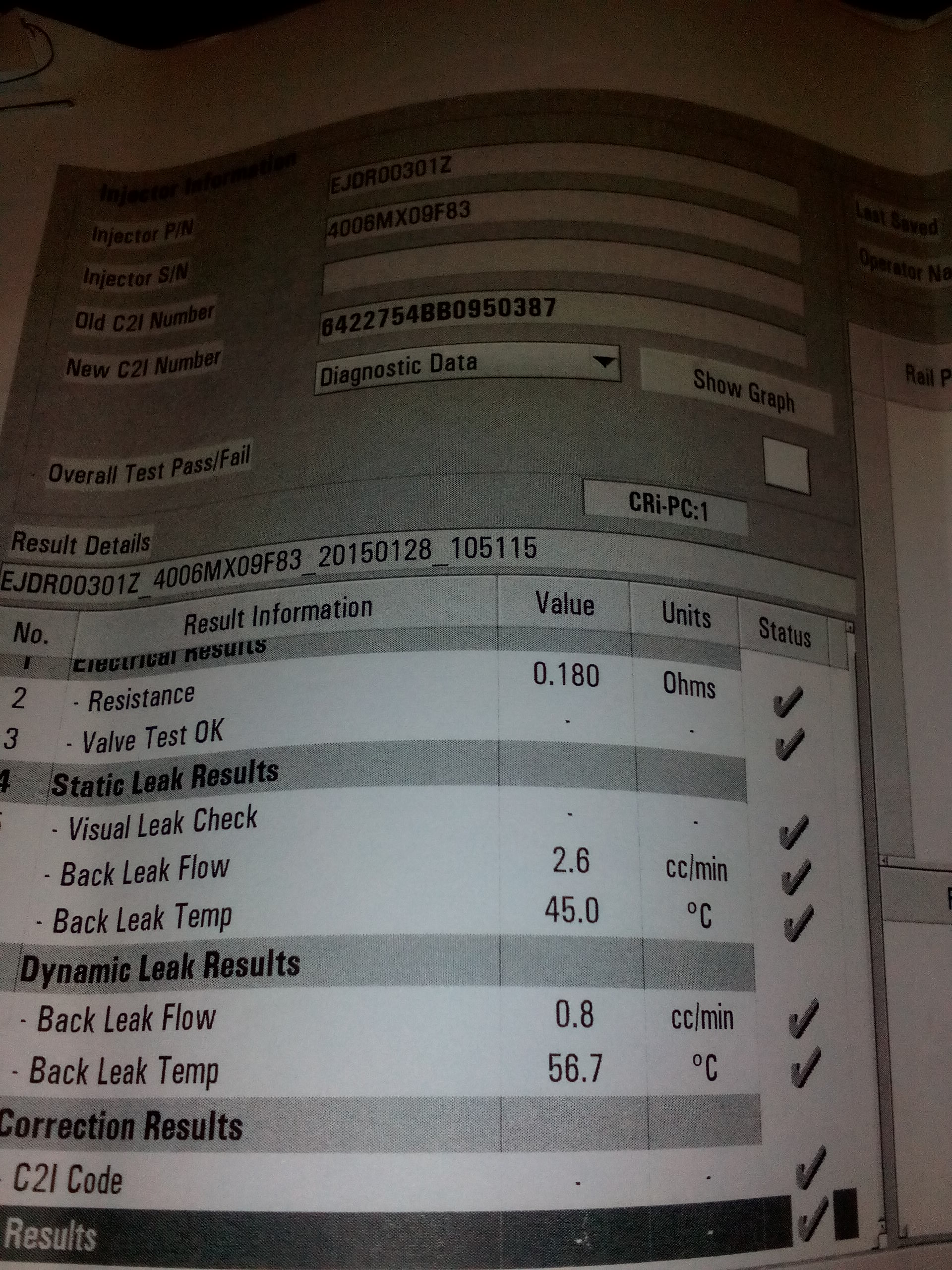 Вече има и доста по добри цени,всичко е Делфи и е с гаранция.Примерно 1. диагностика на дюза включва смяна на капачето отпред на върха до разпръсквача,нова дифтунга и нов код за дюзата +труда за сваляне и закачане на дюзата после общо 40лв..Ако излезе нещо за смяна като клапанче или разпръсквач цените бяха 140 клапана общо с труда и мисля 112 беше ако е разпръсквача.Значи грубо 180лв. ново капаче,клапанче,дифтунга нов код и труд,всичко на Делфи и човека си поема гаранция ако се направи всичко както трябва.Относно новия код,четох на 1000 места че не е нужно нов код ако се сменя само клапан но той каза друго.При всяко сваляне за по-добра работа трябва нов код и смяна на дифтунгата и капачето на дюзата дори и тръбичките от рейката до дюзата ,но за нас това е лукс.Иначе всичко е на Делфи ,стенда му е от доста по-новите ,работи само със системи Делфи,сега взеха и на БОШ.Ако някой се интересува мога да дам телефон или адрес на ЛС. Дано се вижда на снимката ,това е карта на дюзата след ремонт,ако една от тези отметки не е положителна а е Х не може да се издаде нов код.При всяко закачане на дюза се разпечатва работна карта на дюзата.