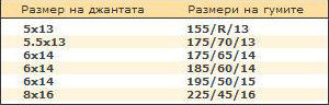 има едно старо златно правило :lol: : ширината на джантата + 30мм, тоест за предни можеш да сложиш 205, но за отзад ще е добре да са 215 или 225. между другото откъде намери такива широки 13ки :shock: и гумите ще са някакви доста редки...