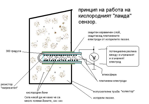 Това го прави ламбда сондата "кислородният сензор" но как, компютъра си разбира от електрически сигнали, а не от изгорели газове, много просто, просто преобразува разликата между вън и вътре във електрицески потенциал, и го подава на компютъра, който вече знае как да ги чете тези сигнали.