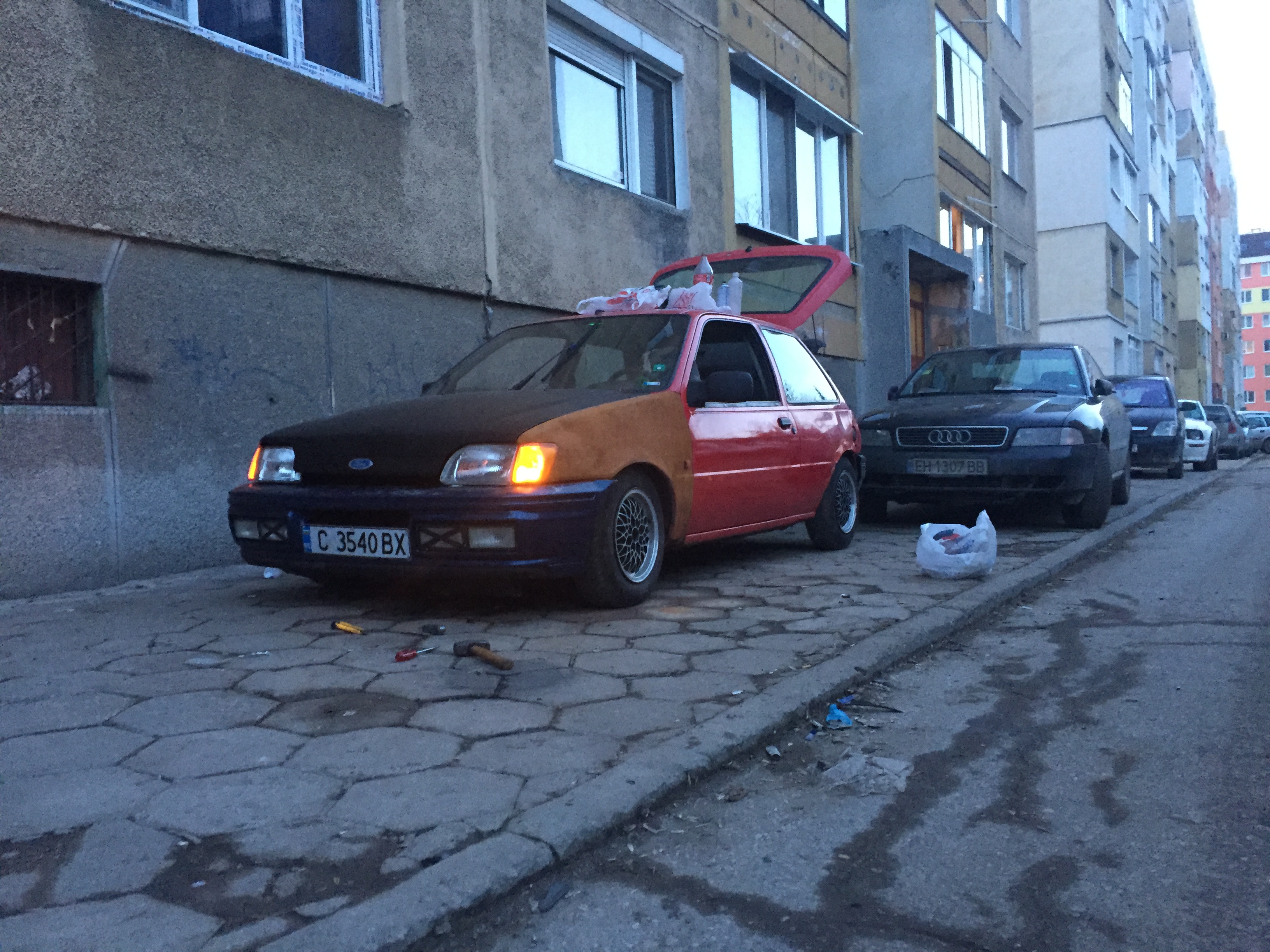 Здравейте . Реших да ви представя първата си кола ford fiesta mk3 от 91 година. Двигателя е много слаб 1.1 50 коня , купето е доста запазено като за форд... но е ударена преди години отзад и е започнала да загнива. Нямам много снимки на колата но я имам от 2 месеца и всяка свободна секунда съм покрай нея.А за форума разбрах от един приятел а и от малък се радвам на коли с раждясали калници или капаци и реших и мойта да стане рат. Надявам се да ви хареса