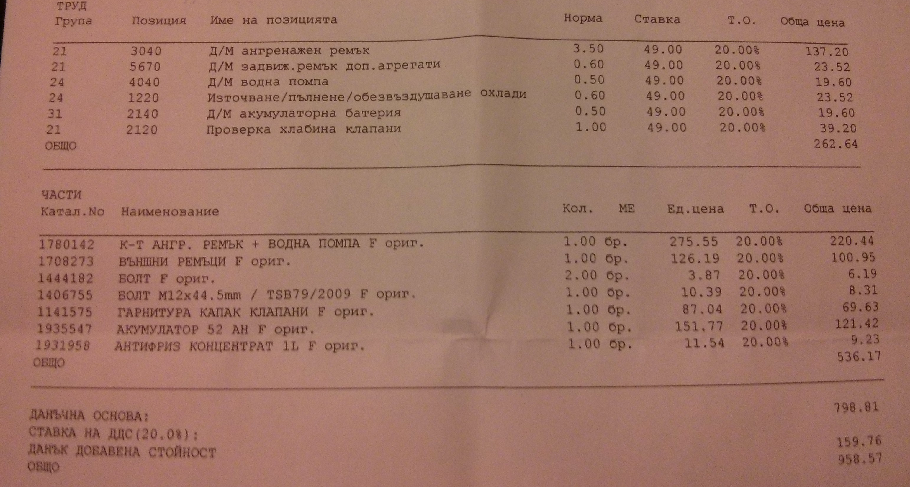Всъщност не съм видял за клапаните, таксували са ме (но цената като цяло беше почти същата, като по оферта без проверка на клапани). Качвам фактурата и офертата за окачването, което ми направиха. Смятам да сменя само тампона на рейката, който е належащ, но не при тях (за 200лв.