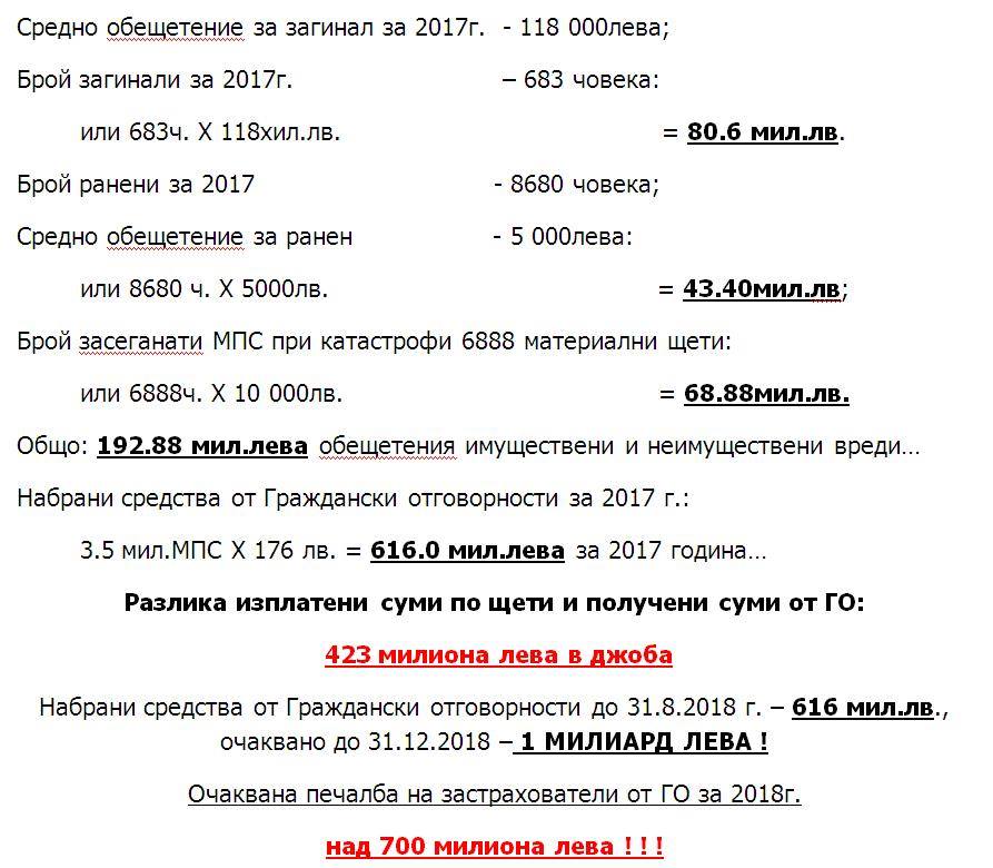 Само проста сметка – годишно при автопроизшествия в България загиват 600-700 души. И да има обезщетение за всеки загинал (а това е невъзможно, голяма част от шофьорите се пребиват сами, без участие на друг автомобил), дори по 50 хил. лева за всеки загинал, това са към 30 млн. лева годишно. А застрахователите събират само от „Гражданска” около 1 млрд. лева годишно