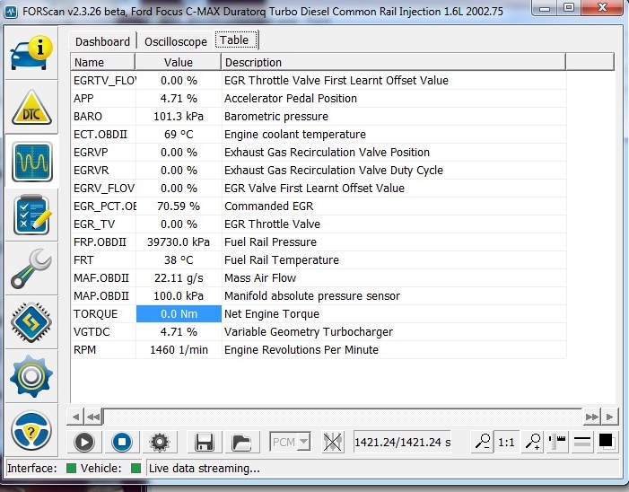 Това което ми прави впечатление, че при различните режими, предпоследния показател (VGTDC / Variable Geometry Turbocharger) не променя стойността си, а сякаш не би трябвало да е така.
