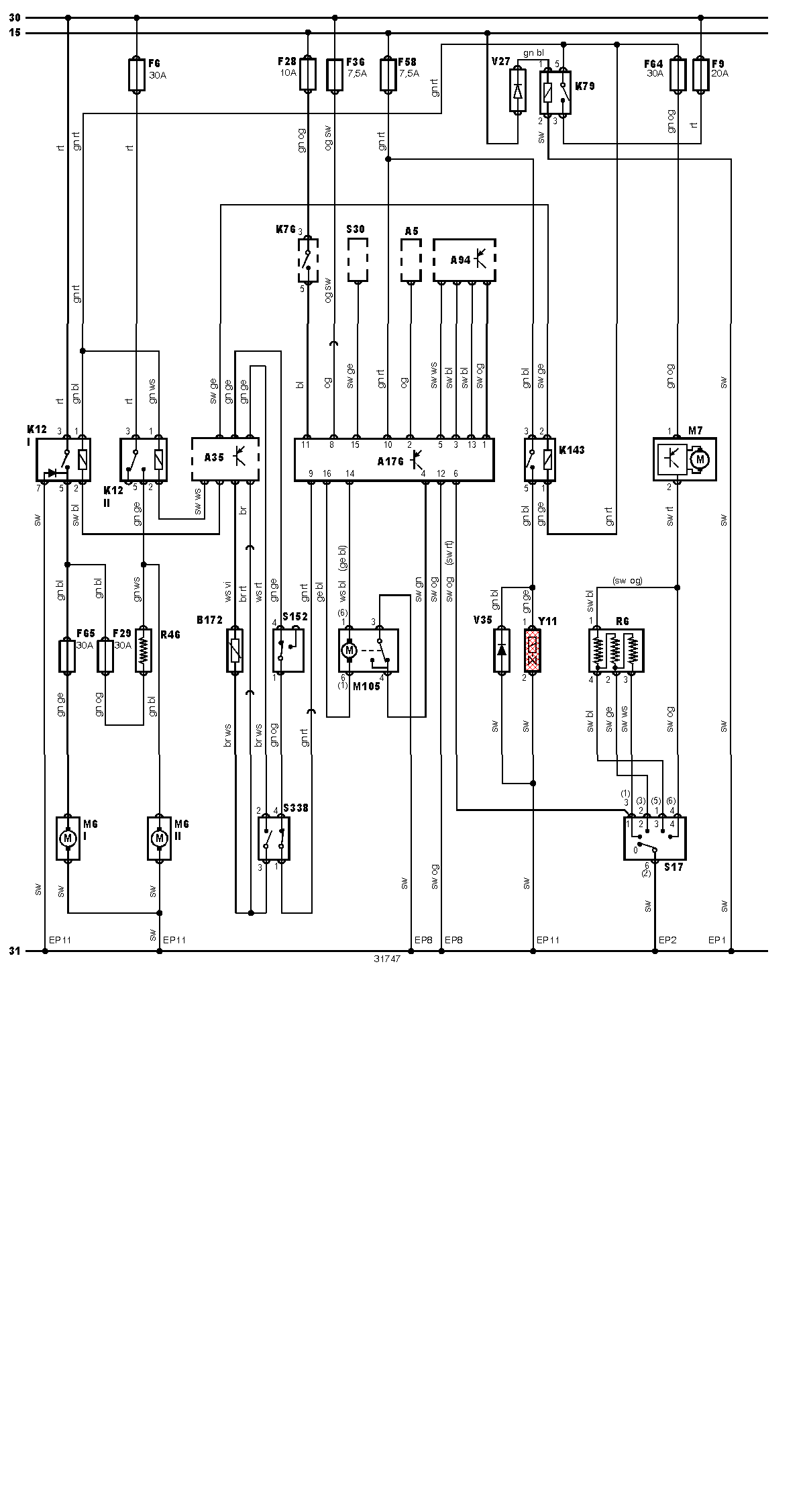 Ето прилагам ти диаграма с добро качество. Общо взето схемата е 2 релета (К12 I и II на схемата) управлявани от ECU-то на колата (A35 на схемата). Различни комбинации на активиране на релетата и резистор (R46) осигуравят различни скорости. Това което трябва да направиш е да подадеш директно на проблемната перка захранване и да видиш дали ще работи. Ориентирай се по цветовете на кабелите от схемата и подай захранване директно от акумулатора.