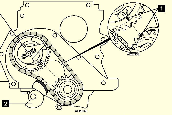 Почва се от 1-ви цилиндър (преди това трябва да си свалил свещите и да си откачил минуса на акумулатора), като трябва да нагласиш буталото в горна мъртва точка (ГМТ). Ако се вярва на AutoData, трябва да съвпаднеш двата белега на коляновия вал и разпределителния вал, както е показано на картинката. Като си готов с 1-ви цилиндър, завърташ коляновия вал (КВ) на 180 градуса по посоката му на въртене. Това ти гарантира, че следващия цилиндър по реда на запалване ще е в ГМТ, в твоя случай 2-ри. Регулираш, пак завърташ КВ на 180 градуса, регулираш следващия по реда на запалване и така, докато стигнеш до последния за регулиране цилиндър.