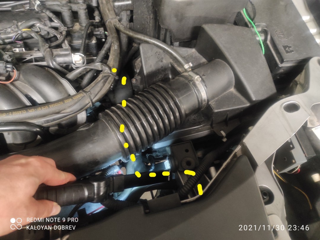 Това не е ли маркуча на картерните газове, който влиза в кутията на въздушния филтър