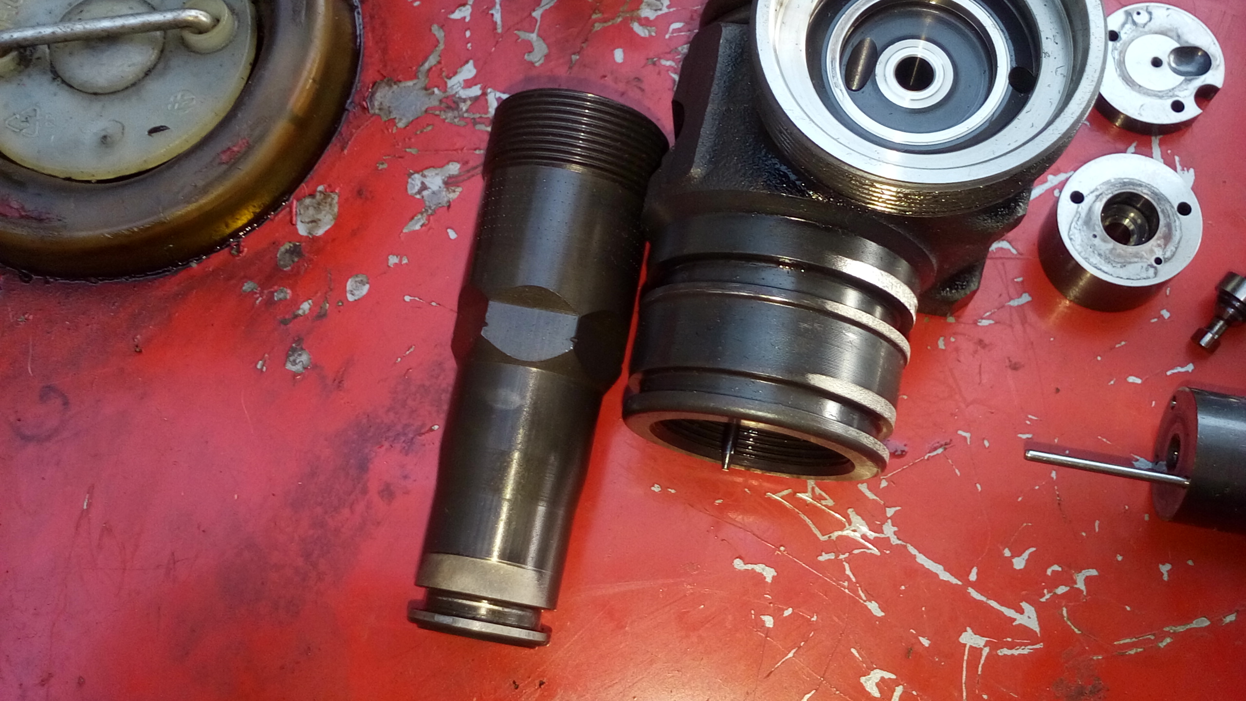 В него имаше и клапан който аз изхвърлих и замених с външен клапан за гориво. Продават се по магазините и са супер надеждни. Имах останал от предната ми кола. Загледах се в изхода на обратната нафта. Там също трябва да има клапан който според руснаците се повреждал. Също слабо място. Е моя не работеше. Решението беше ясно. Същия външен клапан за гориво. Закупих и нови гарнитури за помпата, но когато тръгнах да я сглобявам установих много дълбоки наранявани по работните повърхности и на двете помпи. Личеше си, че са много работили доста боклуци са минали от там и са драли по алуминия.
