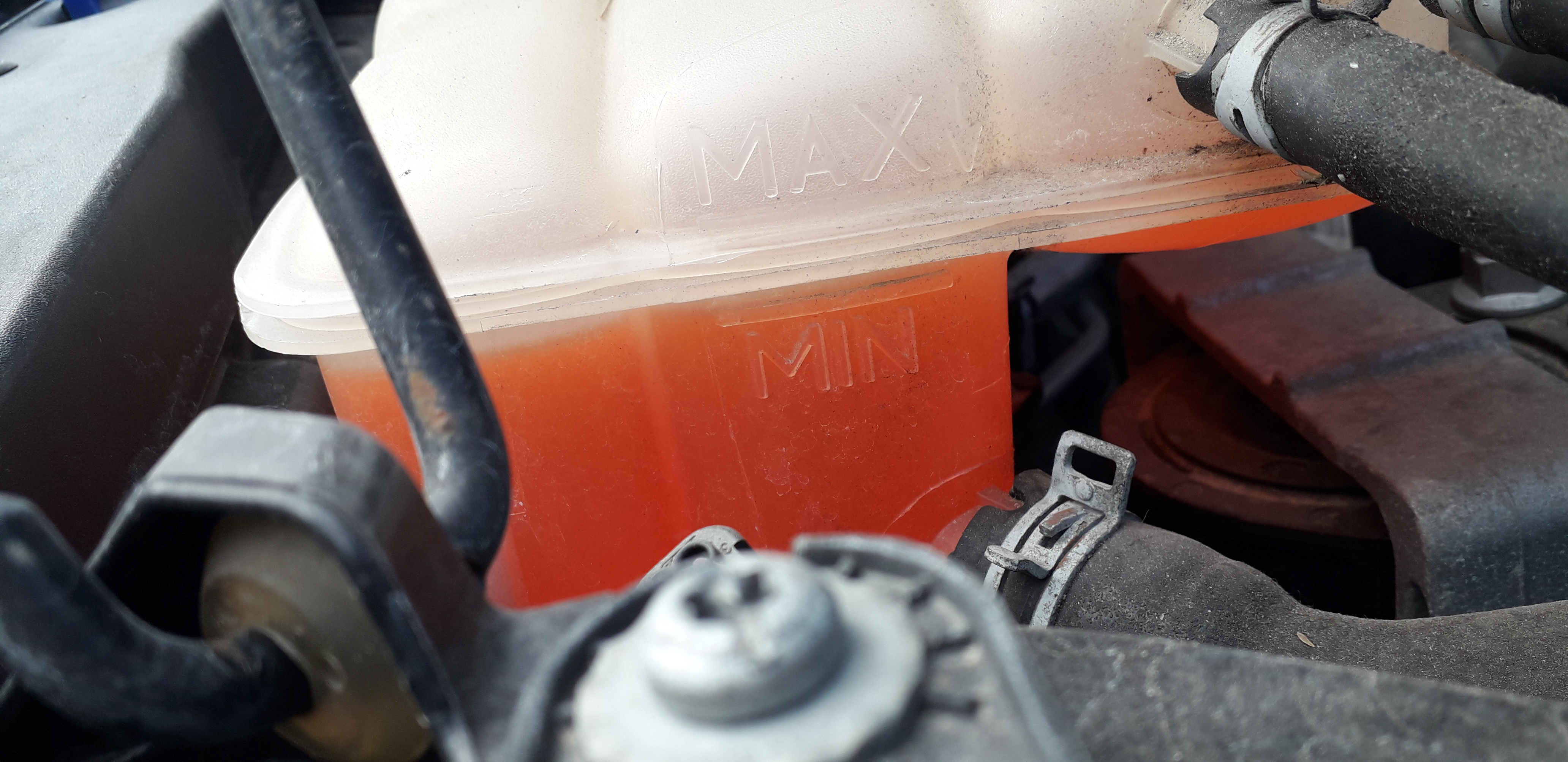 Миналата година (някъде средата на годината), когато бе обслужен автомобила в Мото-Пфое (включително и смяна на антифриза), нивото на антифриза бе между min. и max. Тези дни ми направи впечатление, че е на минимума в момента (студен двигател, на снимката).