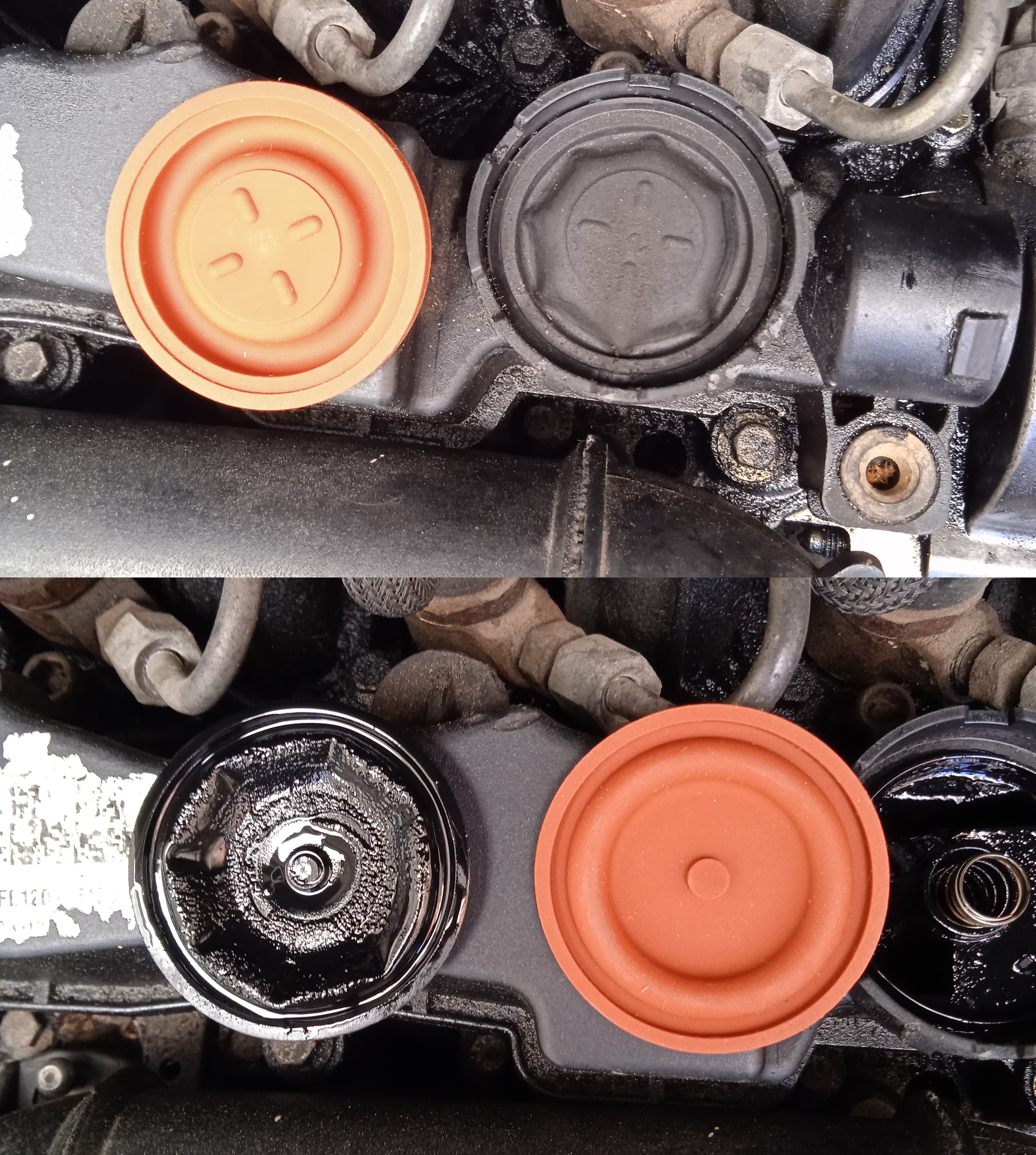 Вчера най-накрая се наканих и смених мембраната на клапана за вентилация на картерните газове. На снимката се вижда в какво състояние е старата мембрана. Нямаше дупки или скъсвания, но сякаш се е раздула с годините.