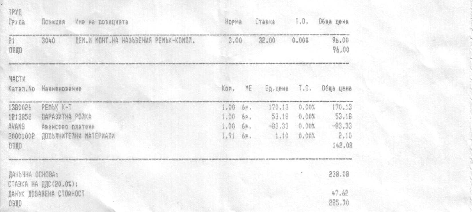 Имаш ли възможност да снимаш/сканираш фактурата?ImpossibleMan написа:Миналия месец сменях на Фиестата масло и всички филтри. Излезе ми 231 лева с ДДС и труда. Най-скъп се оказа филтъра на климатика - 47 лева с ДДС. Значи без него, наистина щеше да ми излезе 180 лева. Става въпрос за Мото Пфое Русе. Така, че хората не са те излъгали реално за цената, щом и при мен е подобна